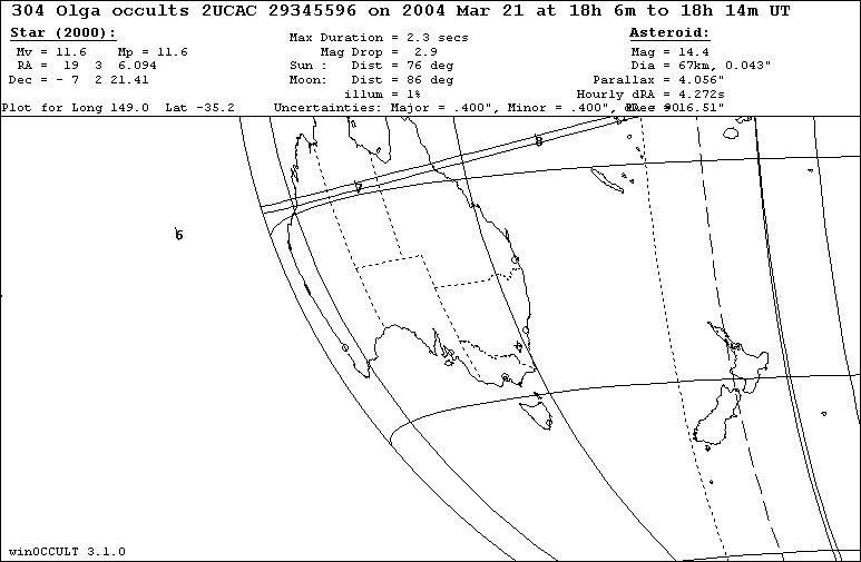 On 2004 Mar 21 UT, the 67 km diameter asteroid (304) Olga will occult a 11.6 mag star in the constellation Aquila for observers along a path across Australia.