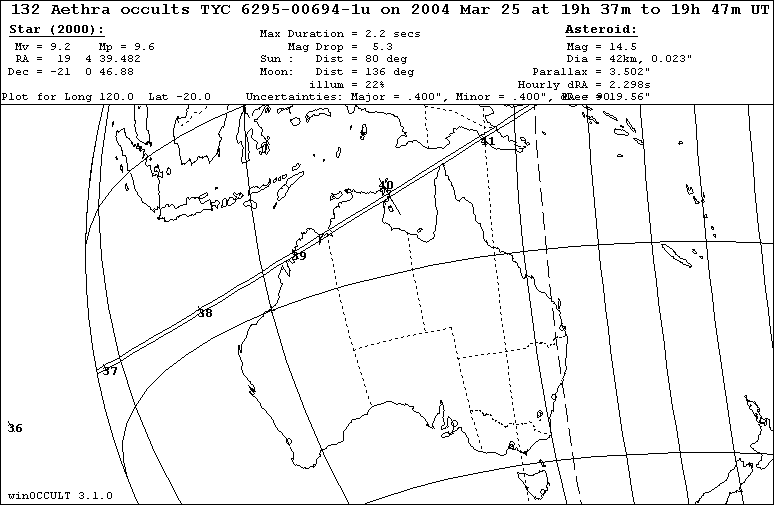 On 2004 Mar 25 UT, the 42 km diameter asteroid (132) Aethra will occult a 9.2 mag star in the constellation Sagittarius for observers along a path across N Australia.