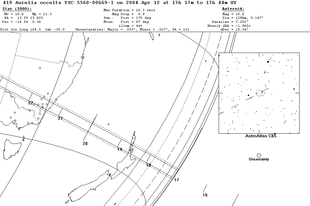On 2004 Apr 12 UT, the 129 km diameter asteroid (419) Aurelia will occult a 10.6 mag star in the constellation Virgo for observers along a path across New Zealand, Australia.
