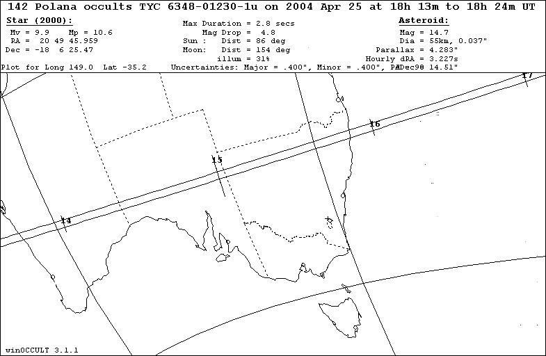 On 2004 Apr 25 UT, the 55 km diameter asteroid (142) Polana will occult a 9.9 mag star in the constellation Capricornus for observers along a path across Australia.