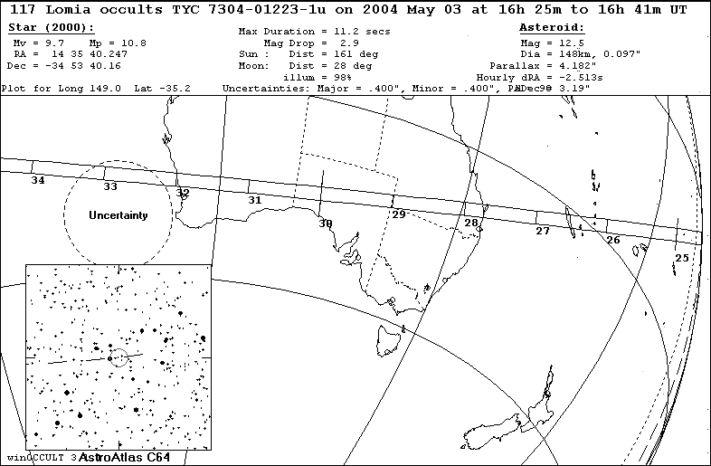 On 2004 May 03 UT, the 148 km diameter asteroid (117) Lomia will occult a 9.8 mag star in the constellation Centaurus for observers along a path across Australia.