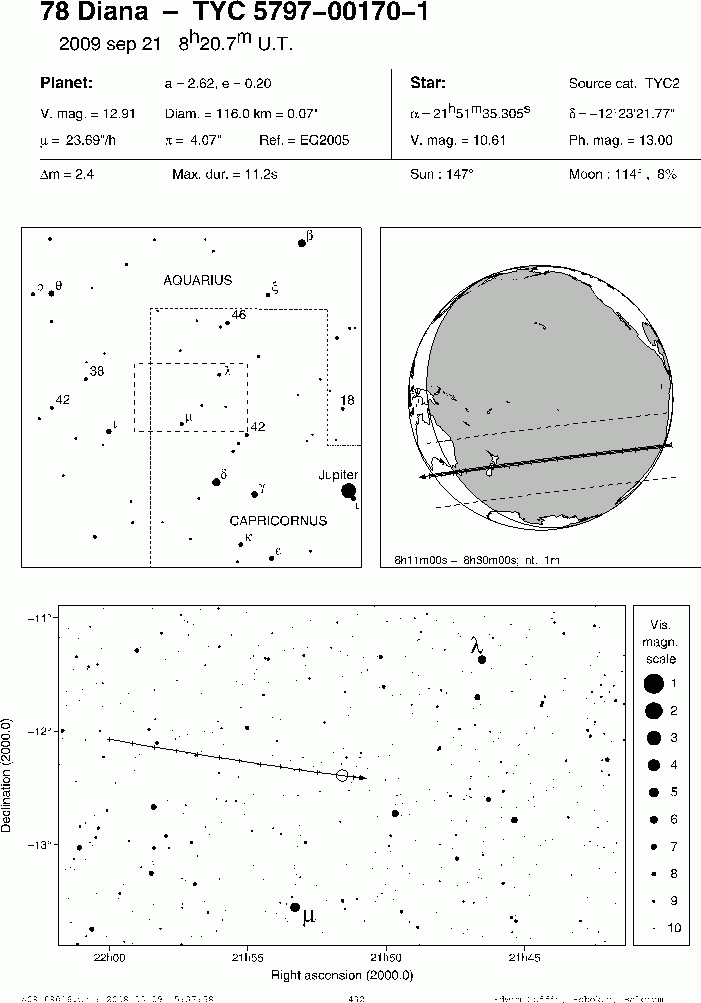 On 2009 Sep 21 UT, the 121 km diameter asteroid (78) Diana will occult a 10.6 mag star in the constellation Capricornus for observers along a fairly broad path across central New Zealand from Masterton to Karamea, including Auckland.